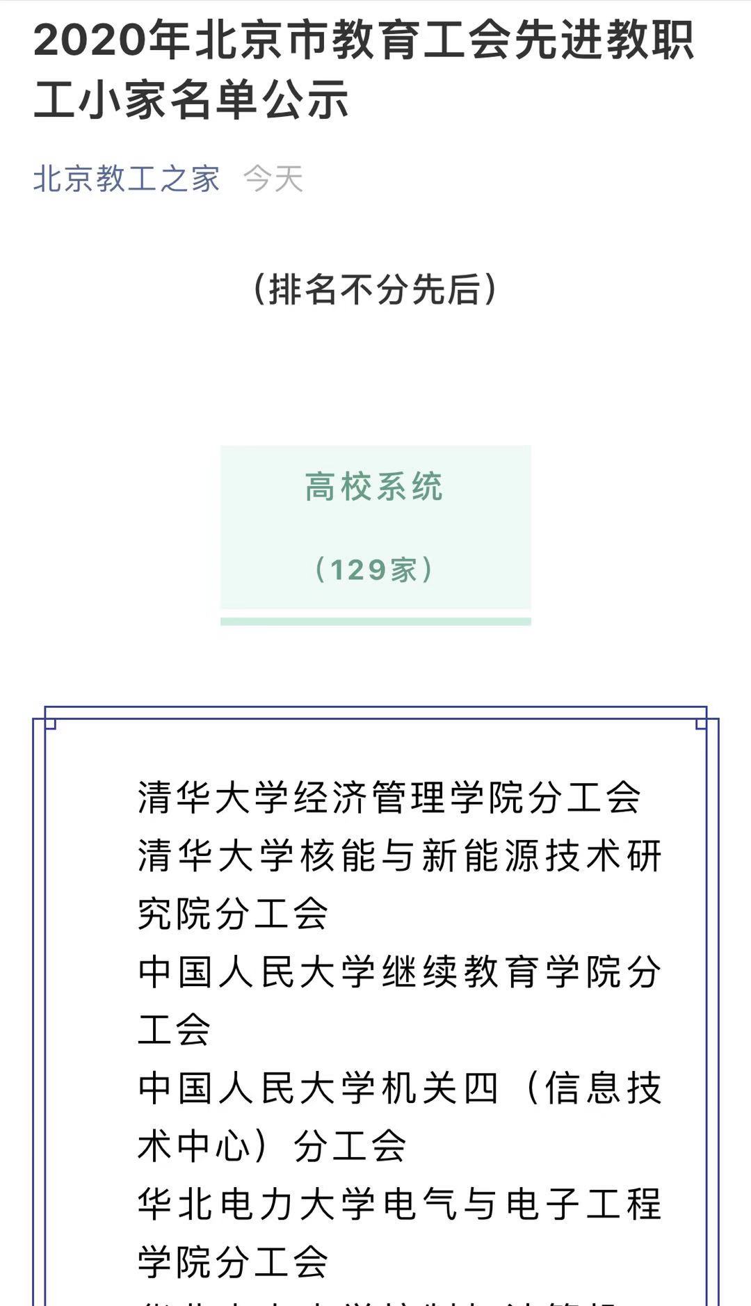 分工会在学校工会的正确领导下,在学院党政领导班子的大力支持下,经过全体工会会员的共同努力,获评2020年北京市教育工会先进教职工小家。
