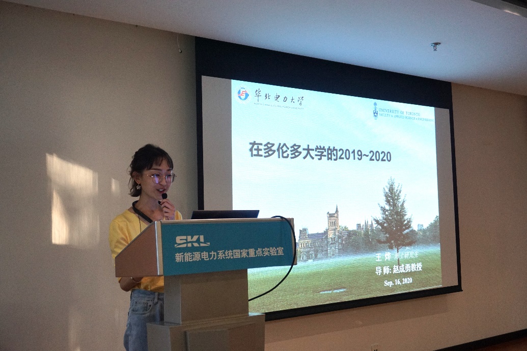两位老师报告之后是新能源电网研究所代表研究生的报告。第一位报告的是赵成勇教授指导的王烨博士。王烨博士的报告内容是“在多伦多大学的2019~2020”,她向我们介绍了她在多伦多大学的求学生活。不同的文化交流、不同的教学方式、不同的异域风光,求学生活丰富多彩。王烨博士告诉我们要勇敢地去尝试,遇见更好的自己。