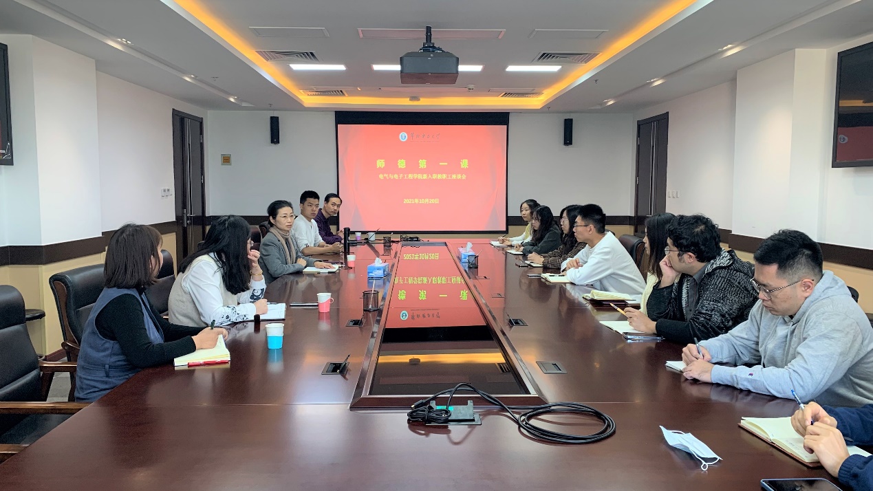2021年新入职教职工在主楼A601会议室共上一堂“师德课”。学院党委书记卜春梅、学院党政办公室主任刘春磊以及11位2021年新入职教职工参加会议。