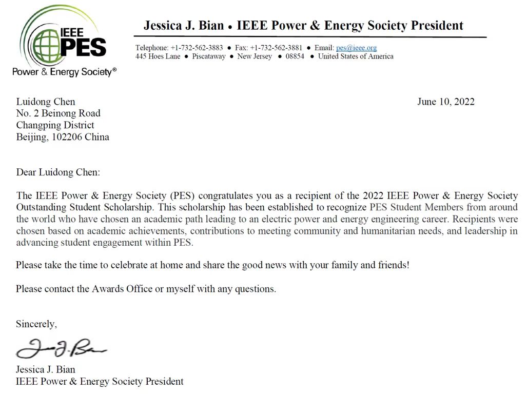 IEEE电力与能源学会杰出学生奖学金由IEEE PES于2019年设立、并由PES捐赠奖学金基金(PES Endowment Scholarship Fund)资助,以奖励选择电力和能源工程事业作为学术研究方向的优秀研究生,每年在全球范围内评选5人(亚太地区仅1人),是全球电力与能源领域的研究生最高荣誉。