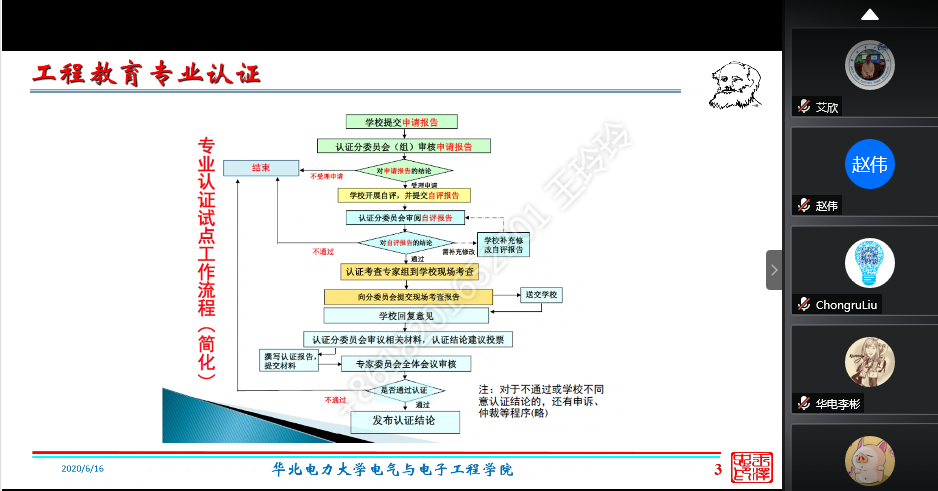 电气工程及其自动化专业通过认证的成功经验,对通信工程如何做好专业认证进行了指导。艾教授认为大学分为北京、保定两地办学,但是人才培养方案应该是统一的,至少培养方案中的必须课程应该完全一致,选修课程基于学生开展实习实践的条件不同可以具有地方特色。