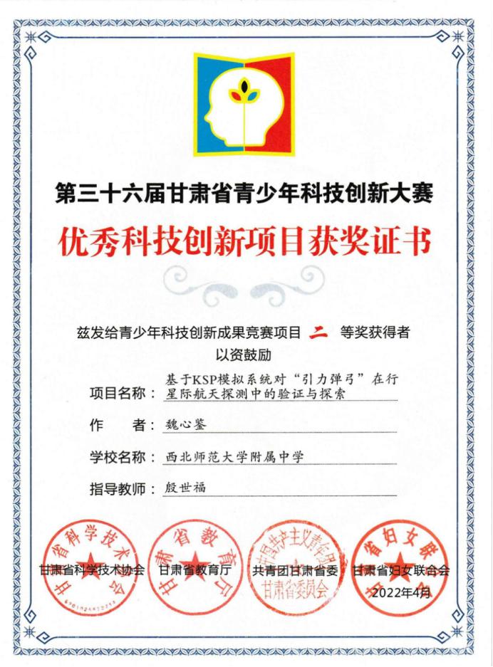 中华儿女多奇志,漫步寰宇问苍穹。魏心鉴还有着对航空航天的热爱。他深知一次次长征腾空、嫦娥落月的背后是无数科研人员的孜孜不倦、精益求精。他将这种精神化于学科探究之中,高二时看到第三十六届全国科创比赛的举办消息,他不假思索地报了名。面对科创大赛“创新度、实践度、精深度”的办赛理念,基于对航天的喜爱与相关专业知识,魏心鉴将自己的研究课题定为了《基于KSP模拟系统对“引力弹弓”在行星际航天探测中的验证与探索》。从调阅论文、查阅各国相关资料、设计测试方案、组织模拟测控网,到“引力弹弓”轨道设计、单个航天器的设计布局、发射,再到将笔下的轨道设计还原到模拟系统中、模拟各国有关探测器的变轨过程,魏心鉴全部自行完成,最后呈现出自己的课题报告并完成现场答辩,最终获评为省级二等课题。每当遇到艰深的理论或模拟中不测的意外,他也有过无从下手和迷茫彳亍。他热爱航空航天,不单单欣赏腾飞升空的绚丽和遨游天宫的浪漫,更感动于能让这些庞然大物如燕般翻飞的力量与精神。“从最小的旋翼机到偌大的空间站,工程师们能够将它们从图纸变为现实,从零件变为整体,从实验室走向空天,背后一丝不苟、尽善尽美的精神,不应该是每一个华电人应有的品质吗?”魏心鉴说出了他热衷科技创新的原因。他以华电甘肃省第一名的成绩进入污污漫画