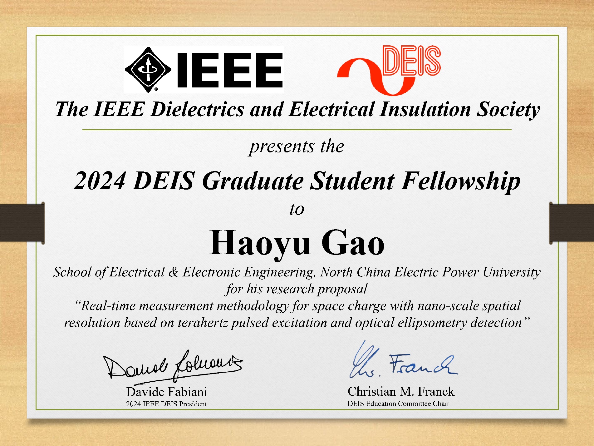 2021级博士生高浩予荣获2024年度IEEE DEIS Graduate Student Fellowship(电气绝缘领域的研究生最高学术荣誉)。