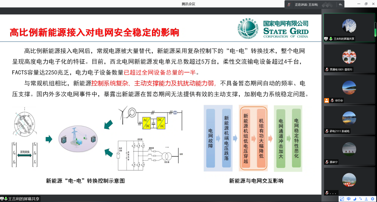 邀请国网西北电力调控中心系统处处长王吉利作为嘉宾走进电力企业专家讲堂,讲座题目为大规模集中接入新能源暂态主动支撑性能提升的关键技术探索与实践,电气学院本硕博贯通班和优秀学生共80余人聆听了讲座。