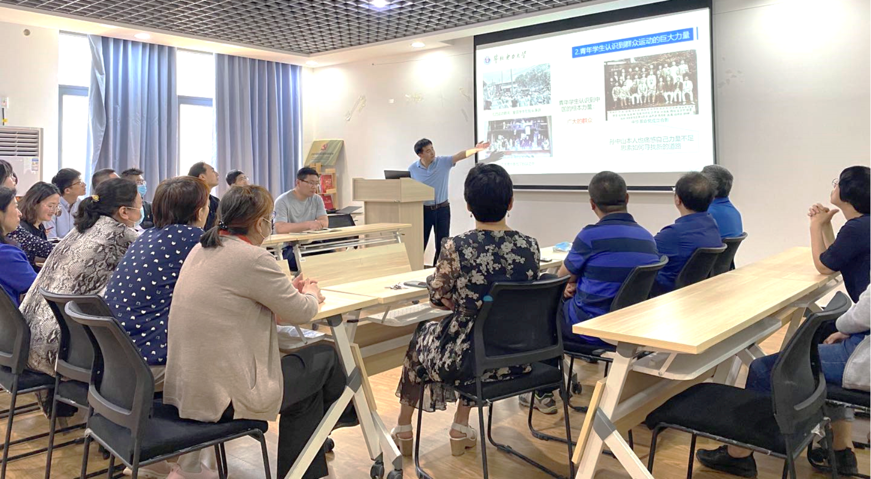 随后,王硕以五四运动为主题讲了一堂专题微党课,他从革命热情高涨的“红五月”引入,讲述了五四运动的历史故事,探讨了成为时代新人的内在脉络,与大家共同感受了那个时代青年们的那股蓬勃昂扬的精神力量,那种热爱国家、敢为人先、不畏强权、奋起反抗的五四精神。大家感到能源革命的当下,我们同样需要五四精神,敢为天下先地去创新和求索。