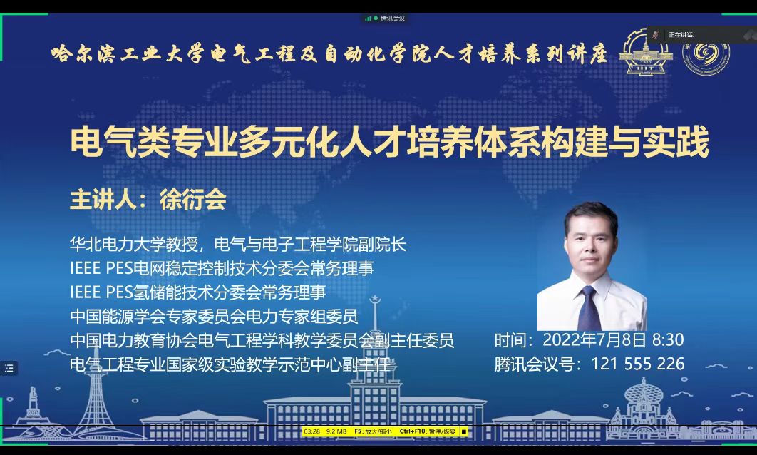徐衍会首先就哈尔滨工业大学在历史上对华北电力大学电气类专业发展建设给予的大力帮助表示了诚挚的谢意,然后开展了以“电气类专业多元化人才培养体系构建与实践”为题的讲座。报告分为三个方面:一是华北电力大学的能源电力特色和电气与电子工程学院的人才培养目标定位;二是我校立足电力行业的电气类专业多元化人才培养体系的构建与实践;三是我校电气工程及其自动化专业2021版人才培养方案制定的详细过程和主要创新之处。