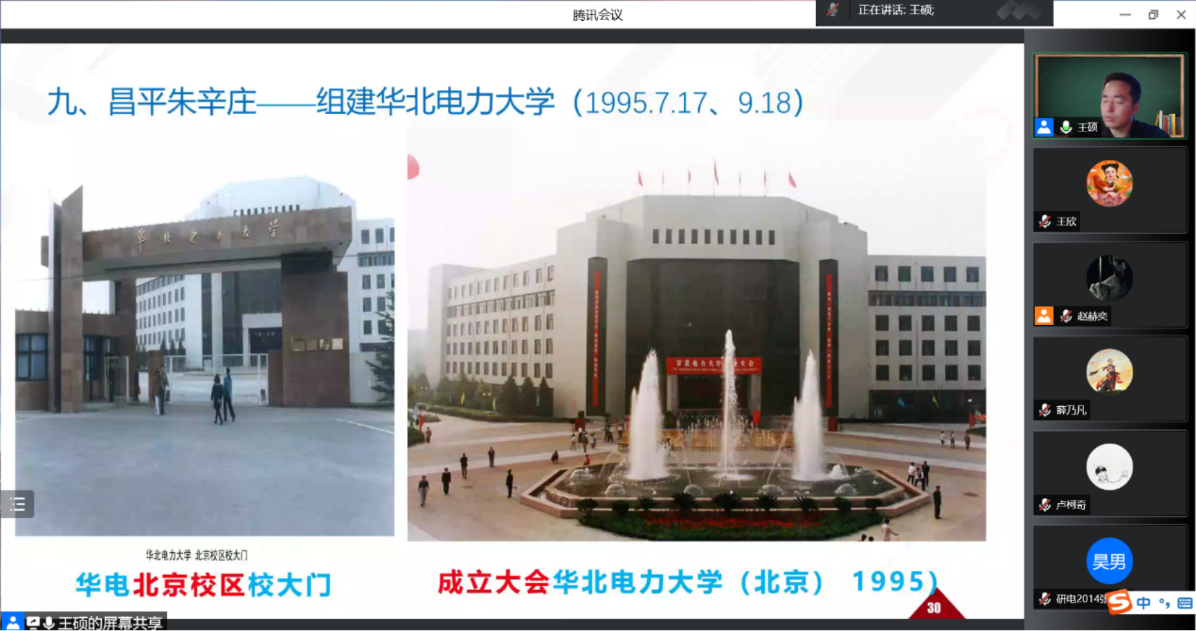 校史是校园文化的宝贵财富和重要资源,为提高学生的文化认同感与集体荣誉感,进一步落实好学校的学风建设工作,根据党委学工部的主题教育活动安排,7月3日周日下午,电气与电子工程学院学生工作办公室、能源电“历”环游记工作室组织了一堂线上微讲座。学院党委副书记王硕作为主讲人,以“从大盆胡同、天津马场、北下关、清河小营、岳城水库、省人委大院、定福庄到朱辛庄——1950年代至1990年代的校史轶事与时代变迁”为题,与270余名电院本硕博学子和部分校友、家长进行了交流。