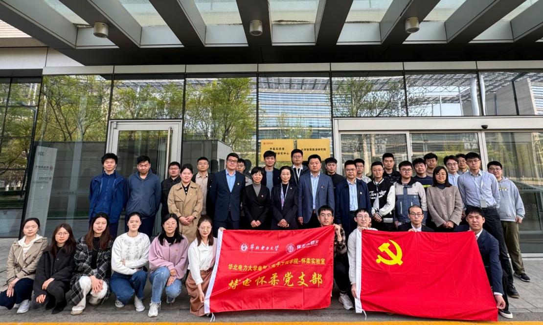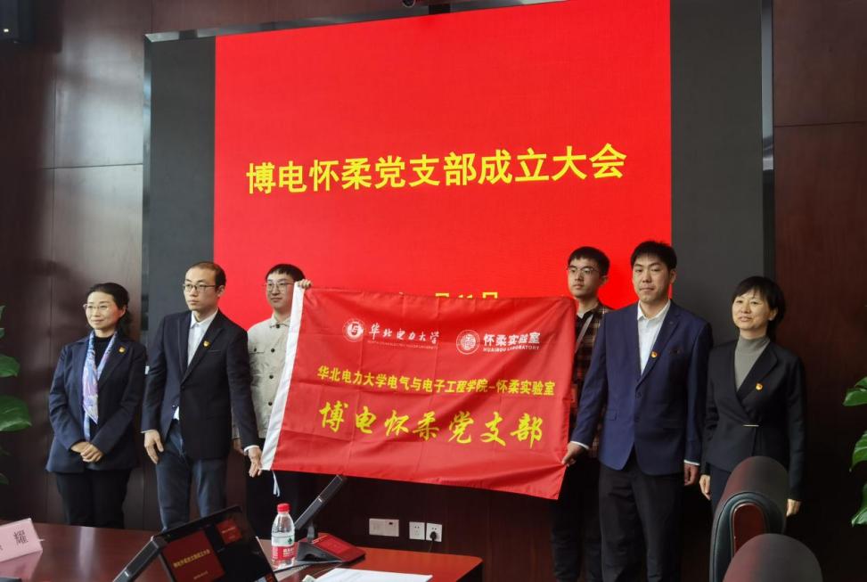 华北电力大学电气与电子工程学院党委书记、发展与教育培训部部长为博电怀柔党支部授旗。