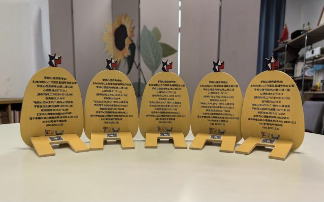 作为心理文创作品,手机支架背面还“暗藏玄机”——印有学院、学校、北京市三级心理咨询电话,以及校医院和保卫处电话等,“这是对师生们心理健康的⼀种关怀和提醒,在面对学习、生活压力时,鼓励大家及时寻求心理援助,做好自己心理健康的第一责任人。”学院副院长(主持工作)齐磊如是说。