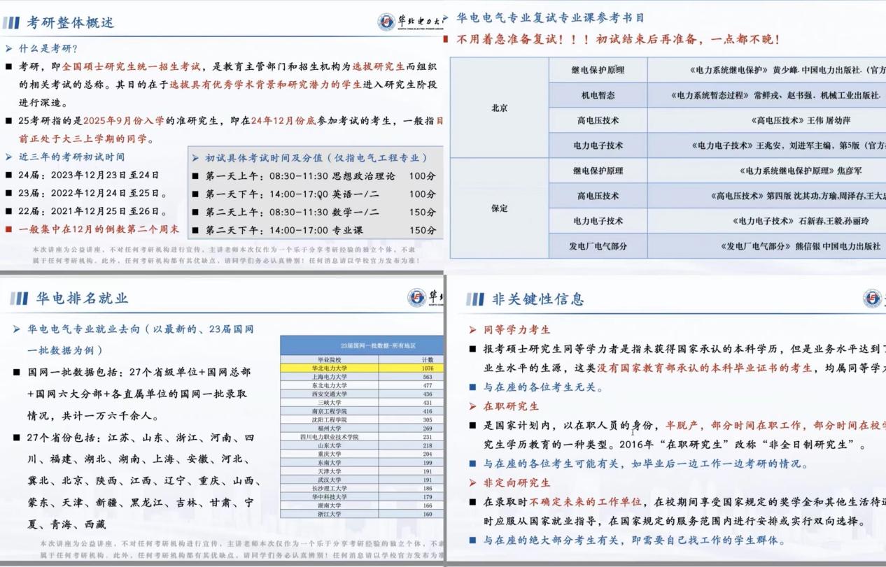 讲座从考研整体概述、华电考研咨询、华电排名就业等方面进行了详细阐述。首先从考研本身出发,介绍考研的整体流程、各专业考试科目以及往年的录取情况。接着火哥向大家介绍了电气专业初复试考试科目及内容,随后对往届考研上岸学生整体情况进行了分析,希望同学们能够按照自己的规划和实际情况合理选择学校专业,同时他建议同学们提前做好考研整体规划,并推荐了专业课复习相关参考书目。