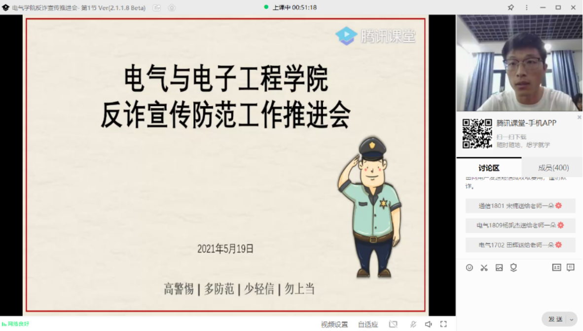 于5月19日晚召开反诈宣传防范工作推进会。本次会议采用“线上+线下”方式进行,史各庄派出所警官程应学、学院党委副书记王硕、保卫处老师康全起、本科2017级辅导员赵兴以及学生党支部书记、班长、团支书、宿舍长共计450余人参加会议。会议由学院团委书记马腾主持。