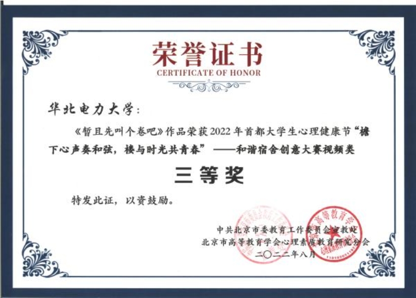 电院知心工作室在此次大学生心理健康节中承办了“和谐宿舍创意大赛视频类”活动,在前期广泛宣传下,工作室收到了来自全校各学院学生发来的投稿,最终《暂且先叫个卷吧》荣获校级第一名并被推荐参加市级比赛,荣获2022年首都大学生心理健康节“檐下心声奏和弦,楼与时光共青春”和谐宿舍创意大赛视频类三等奖及最具风采奖。凭借着独特的立意和精心的制作在38所高校的295份作品中脱颖而出,从谈“卷”色变到谈笑风生,六个人心路的交融、碰撞,最终成就了她们如亲姐妹般的关系,像晨曦清爽的风,像夜晚温情的相伴,从小径到书房,只要是彼此坦诚相待,哪里都是友爱的花海。