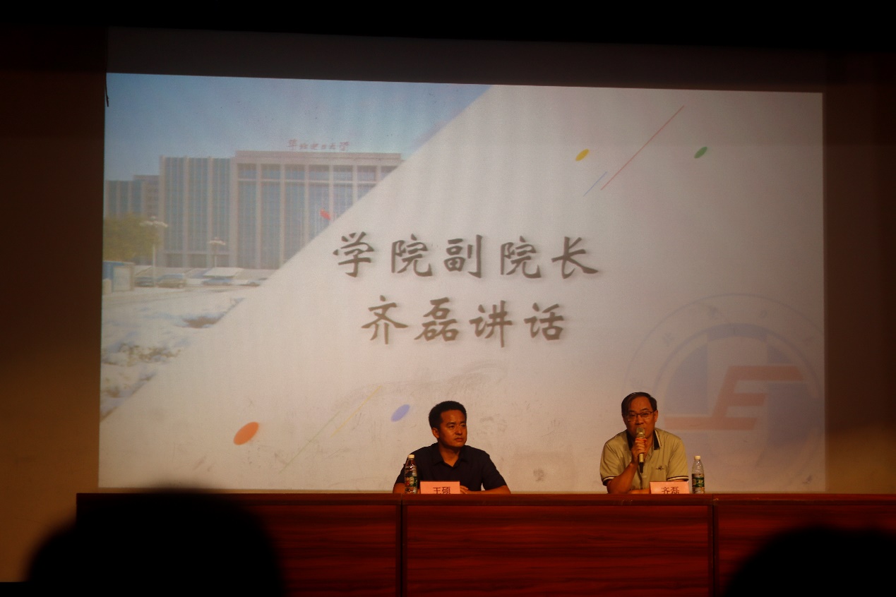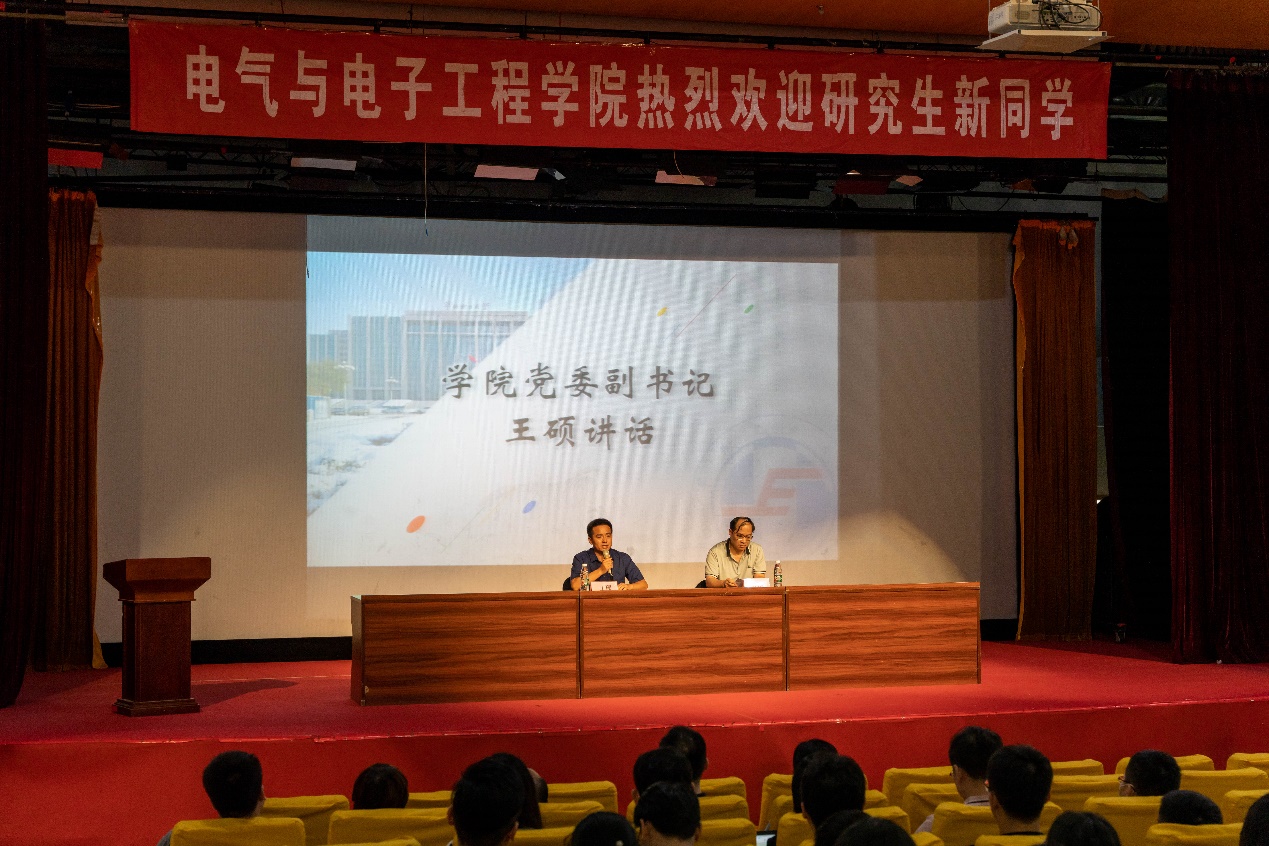 王硕、齐磊对全体新生的到来表示热烈的欢迎,对到场教师致以节日的问候。王硕结合对学校多次迁校的奋斗史、学院专业发展史的介绍,对学院优秀共产党员事迹的介绍,从三个方面对2021级新生提出了希望。希望大家尽快熟悉电院文化和环境,希望大家以奋斗精神直面未知挑战,希望大家扎根下去,以奋进的姿态争取做好一名共产党员或者争取早日成为一名共产党员。齐磊从研究生与本科生新生数据对比入手,说明了学院正处于研究生教育更加被重视的阶段。他从硕士招生类别、时间、条件等方面系统地介绍了学院的招生工作,从学分、学制和论文等方面介绍了研究生培养方案,对于学院研究生管理等方面也进行了介绍。他还对全体研究生新生提出期望,希望同学们保持严谨求实的学习态度和矢志不渝的学习热情,克服外在因素的影响,全身心投入到学习和科研中。王硕、齐磊还结合提前的问题征集,对研究生切实关心的几个热点问题,做出了相关解释。