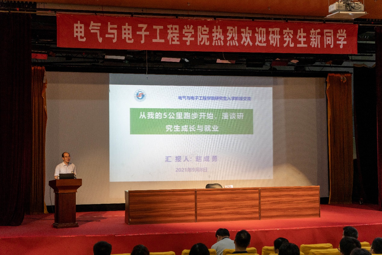 新能源电网研究所所长赵成勇受邀,为研究生新生做了《从我的5公里跑步漫谈研究生成长与就业》的专题讲座。赵成勇以自己的5公里跑步的经历与感受切入,告诫同学们要确立自己的目标,认真落实,把自己的目标严格落实,对自己严格自律,切记好高骛远,长远规划自己的目标,将个人理想与学院学科发展相结合,将个人目标与国家发展和时代需求相一致。赵成勇分享了近几年毕业生就业情况和典型案例,分析了就业形势的变化,希望同学们要目光长远,关注科研机构和一些基层单位的发展空间,要敢于表现自己并创造机会。最后,赵成勇希望同学不要忘记来到华电的初心,要系统掌握前沿知识,增加科研能力,增加自信心,在踏实走好每一步的同时也要仰望星空,成人达己。他的精彩讲座获得了与会师生们的一阵阵掌声。