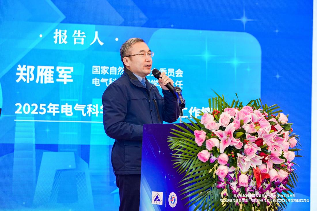 郑雁军作大会主旨报告,重点介绍了2025年度电工学科项目申请和资助情况,展示了电工学科在2025年实现的若干重大人才类项目突破,宣读了2025年电力系统与综合能源、电能存储与应用领域评优结果。