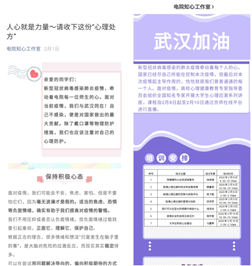 为将网络心理辅导覆盖到每一位学生,知心工作室发布多篇“心理处方”,普及心理健康知识,引导学生加强心理防护,在疫情面前注意增强自身情绪状态的觉察,多与家人进行沟通互助,及时调节消极情绪。积极动员心理委员参与线上心理服务培训课,积极发挥“同伴教育”和“朋辈辅导”的辐射作用,使他们看待心理服务工作的思维和视野得到拓展,树立主动服务意识,积极作为,更好的帮助周边同学。