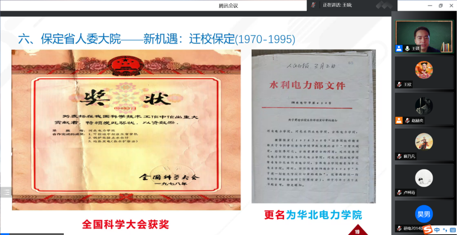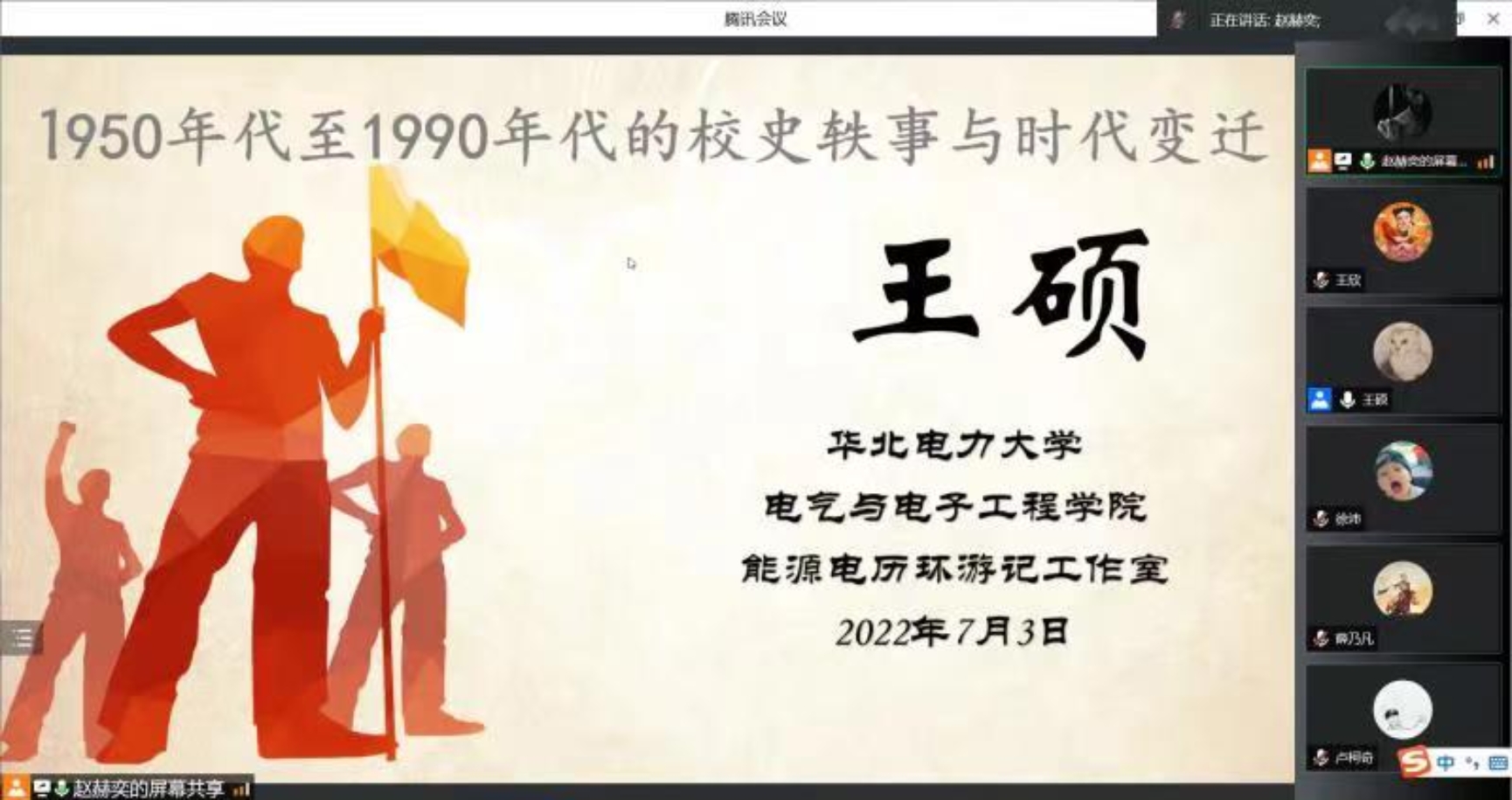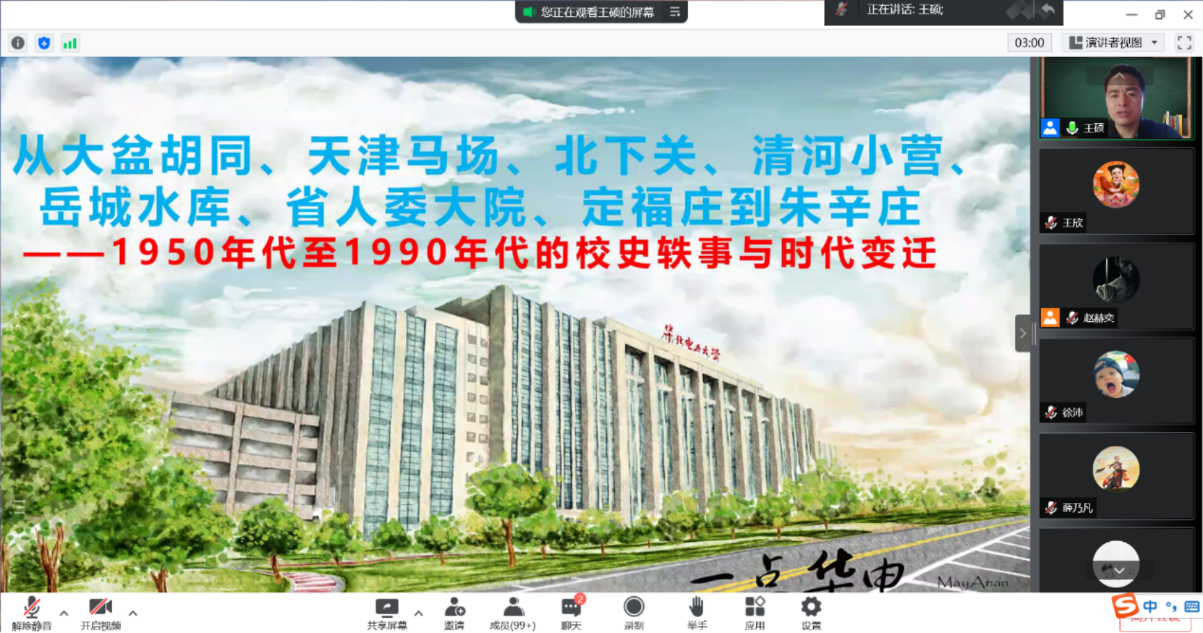 校史是校园文化的宝贵财富和重要资源,为提高学生的文化认同感与集体荣誉感,进一步落实好学校的学风建设工作,根据党委学工部的主题教育活动安排,7月3日周日下午,电气与电子工程学院学生工作办公室、能源电“历”环游记工作室组织了一堂线上微讲座。学院党委副书记王硕作为主讲人,以“从大盆胡同、天津马场、北下关、清河小营、岳城水库、省人委大院、定福庄到朱辛庄——1950年代至1990年代的校史轶事与时代变迁”为题,与270余名电院本硕博学子和部分校友、家长进行了交流。