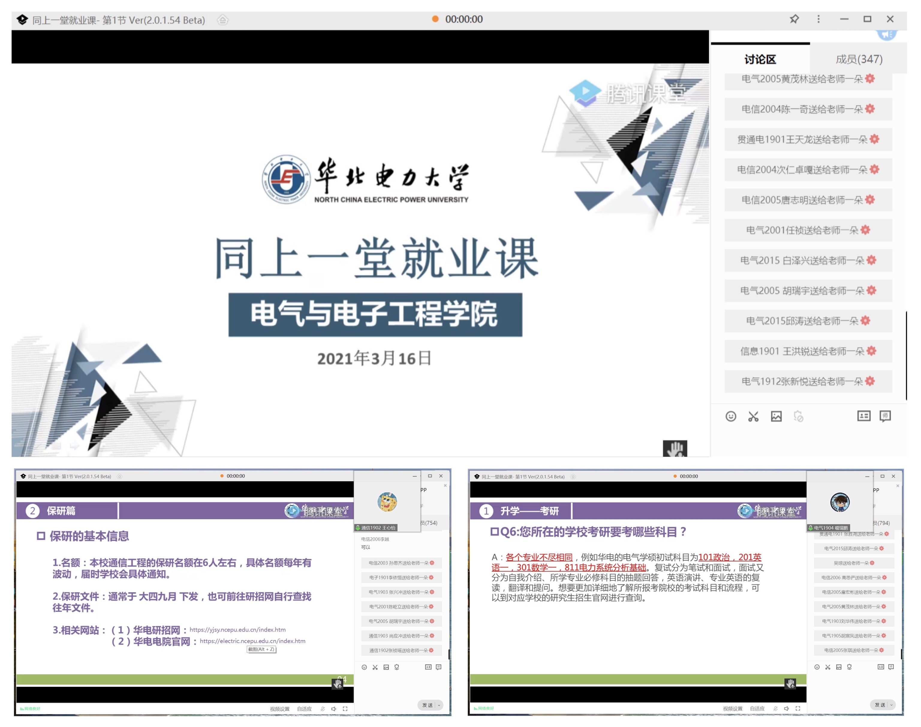 此次就业课之前,包括主讲的8名同学在内,2019级共有16名同学在学院的协调帮助下,主动策划、分组开展准备工作。他们对近几年电气、电网、通信、信息和电子各专业毕业生就业数据进行分析,收集班级同学关注的就业问题,带着这些问题,他们线上、线下分组采访了多名学院校友、本校教师、优秀本硕博毕业生,厘清了同学们关注较多的就业热点问题,然后认真备课,开展多轮试讲。有了这些准备,在此次“同上一堂就业课”活动中,不同专业的8名宣讲同学,顺畅、精彩的从就业、考研、保研、出国、学业提升等五个方面入手,将校友、老师、学长学姐对大家的谆谆教诲和殷切期盼传达给每一位同学,并以问答的形式为大家解答疑惑。同学们听讲认真,讲到精彩之处纷纷“献花”、点赞。