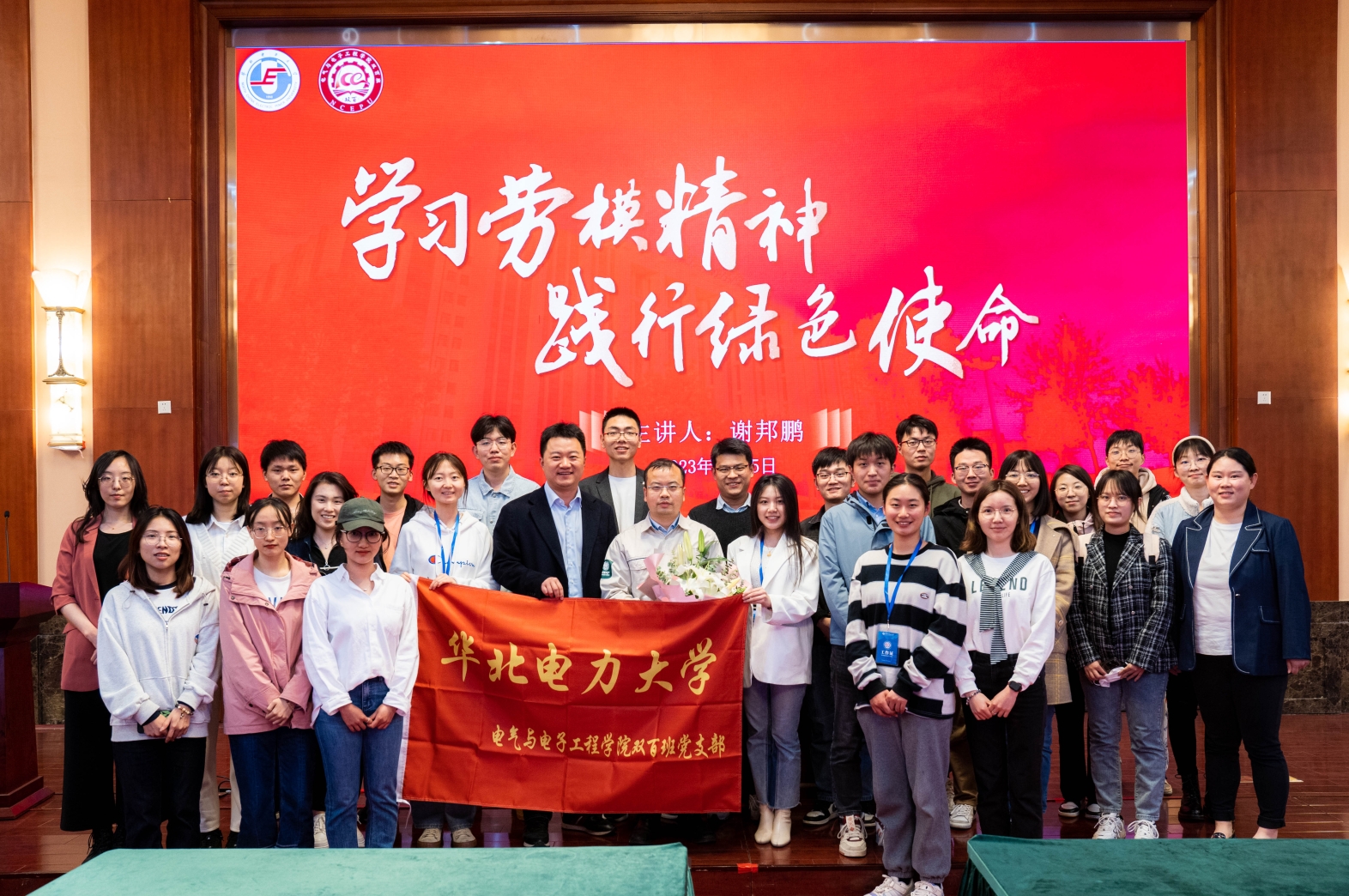 在“五一”国际劳动节来临之际,为深入学习贯彻习近平新时代中国特色社会主义思想,引导青年学子满怀信心投身全面建设社会主义现代化国家,4月25日下午,电院双百班党支部邀请全国劳动模范谢邦鹏,举行了唯实讲堂第一讲——“弘扬劳模精神,践行绿色使命”讲座。电院教师代表、双百班成员以及部分学生代表等约200人现场聆听了本次讲座,反响非常热烈。