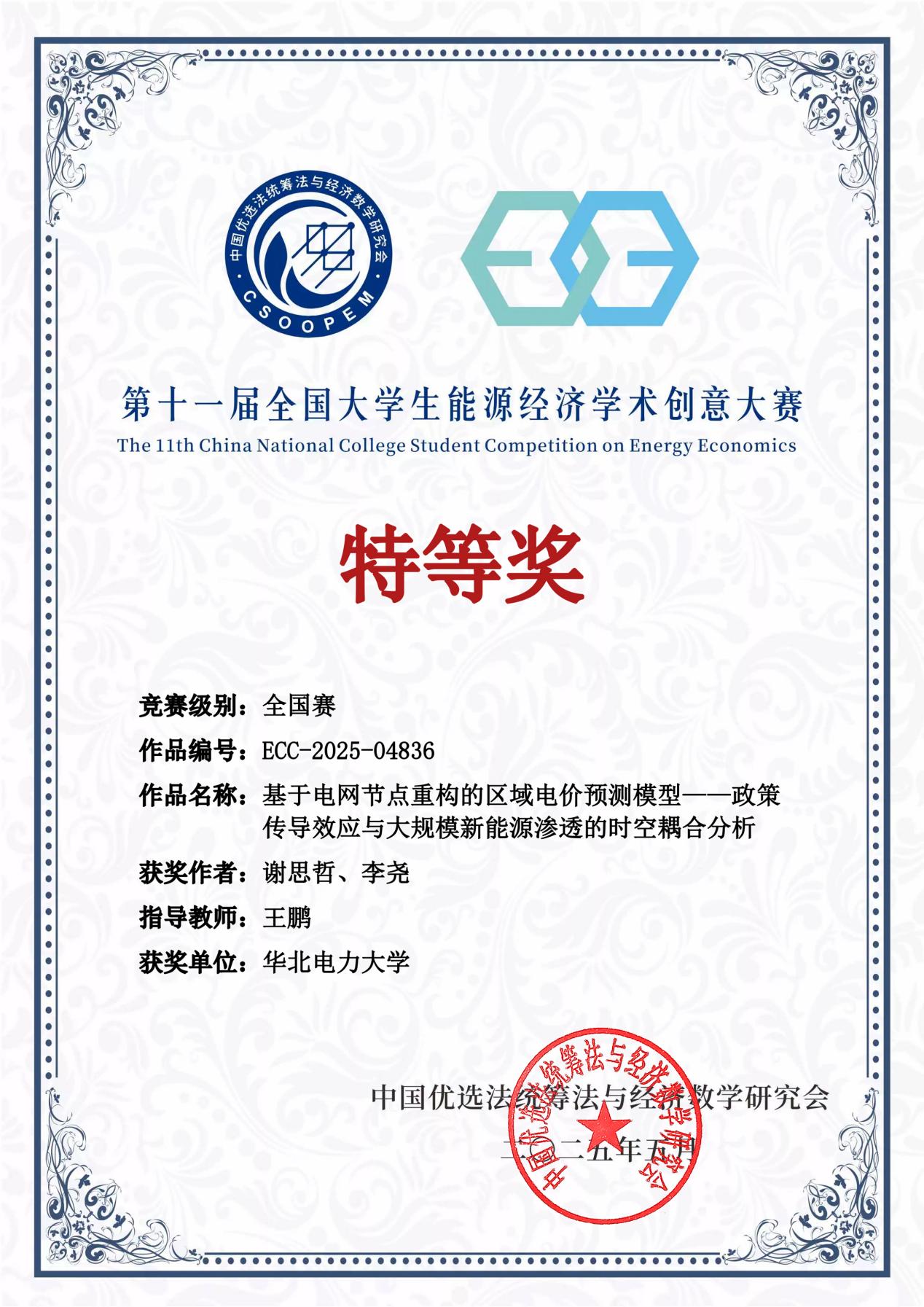 本科生谢思哲、李尧团队参赛项目《基于电网节点重构的区域电价预测模型传导效应与大规模新能源渗透的时空耦合分析》荣获本科生组特等奖,王鹏教授荣获优秀指导教师奖。