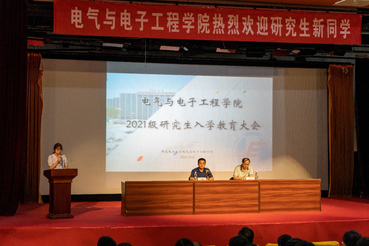 2021级研究生新生教育大会在教三报告厅举行。学院党委副书记王硕,学院副院长齐磊,新能源电网研究所所长赵成勇以及各研究所所长,各研究生班班主任,全体研究生辅导员出席本次大会。会议由2021级研究生辅导员谢雨柔主持。