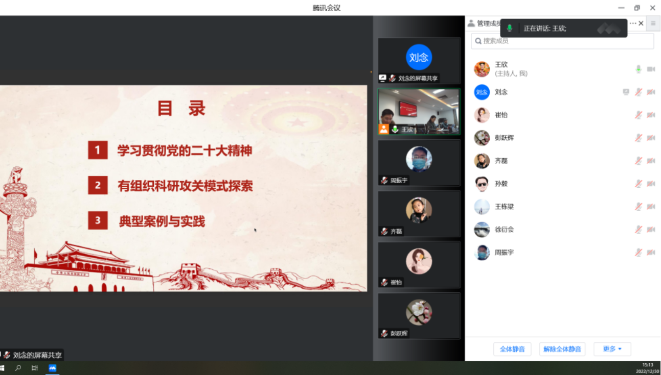 刘念以《贯彻落实党的二十大精神 实施有组织的科研》为主题,从学习贯彻党的二十大精神、有组织科研攻关模式探索、典型案例与实践三个方面进行领学,在学习中大家进一步了解到党的十八大以来我国科技创新发展的历史性、整体性、格局性重大变化,以及在“需求场景+关键技术+首台首套”有组织科研模式下的一大批优秀成果。