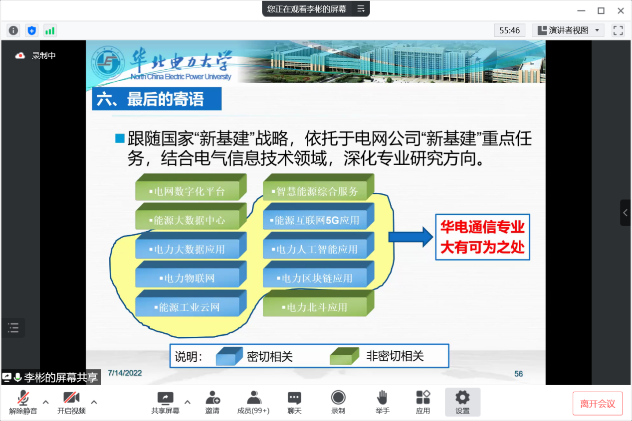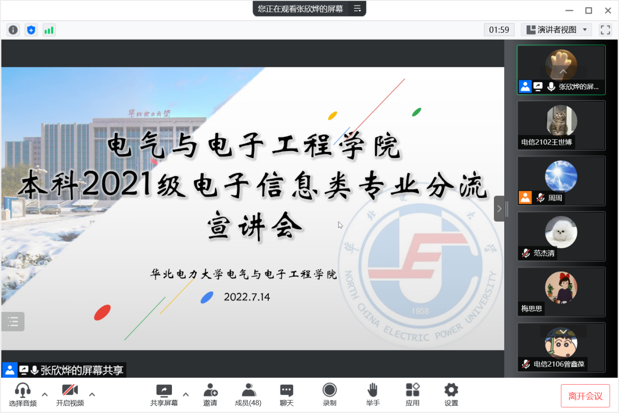 于7月14日14:00和19:00以线上形式召开电气类、电子信息类专业分流宣讲会。此次系列宣讲会议邀请了学院副院长徐衍会,学院党委副书记王硕,电信类专业优秀教师范杰清、廖斌、李彬,教学秘书王玲玲,辅导员张欣烨、周璟峰以及全体本科2021级电气类、电信类学生与部分家长参加。宣讲会由辅导员张欣烨主持。